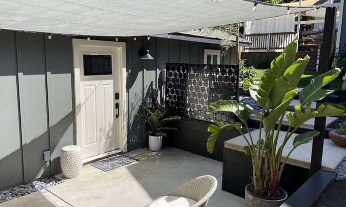 Dean's Garage is a detached building that shares the property with the owner's house. Ideal for one or two guests. It has its own gated space with a level concrete patio covered by a shade sail and cozy string lights; and steps up to a landscaped petite side yard. The house is 540 sq ft, with a separate one bedroom, one bathroom (walk-in shower, Toto washlet, towel warmer), stacked laundry and a full linen closet. This little house has 7 windows, each with light blocking shades or curtains. Our theme follows Dean’s lifetime love of all things vroom and braap, and we had fun decorating: foraged and hand assembled a lot of our own wall art and some things we found on Etsy. We hope you enjoy!