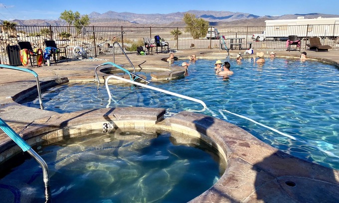 Tecopa’s hot spring water is silky smooth with no odor. At the ground source, the temperature is roughly 118 degrees Fahrenheit, depending on the time of year. The temperature of the water is regulated by adjusting the flow of water into the pools. Pools are regulated to temperatures between 102 - 104 degrees F.