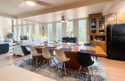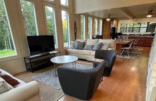 The extensive wrap-around deck with covered area is the perfect space to sip your morning coffee and watch the deer. In the afternoons your crew can play lots of games including ping pong and horseshoes or lay in the three hammocks. The property extends to a wooded ravine with lots of hiking. You won’t have to leave for dinner when you can fire up the gas grill & fire pit. Our kitchen is well stocked with pots, pans and cooking utensils. No need to fear rainy days, inside the house is stocked with WiFi, smart tvs in every room, board games and foosball!