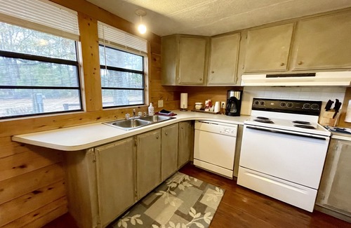 Dee's Lake House is a 3 bedroom 2 bathroom cabin. It has a full kitchen with living and dining room area.