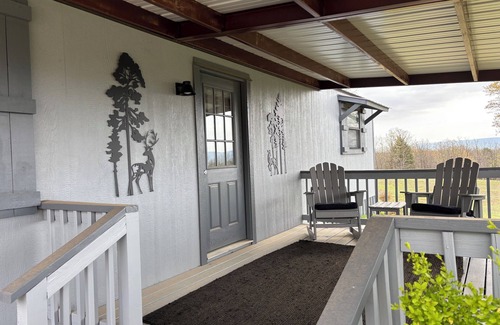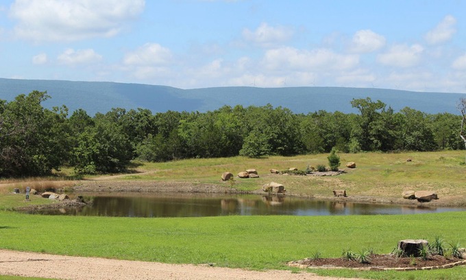 The Deer Cabin is a delightful little cabin! It will sleep up to 4 people. It has a full kitchen, full bath, and bedroom. From the front and back decks you can take in the beautiful views of the Kiamichi Mountain Range. The outdoor area is equipped with a fire pit including seating, and a picnic table as well. There is ample space to roam at Mountain View Retreat! It is a beautiful property with a 4 bedroom house and 3 small cabins that sits on 37 acres. The cabins all face a sprawling view of the Kiamichi Valley. Inside the cabin, is a kind sized bed in the bedroom and a sofa sleeper in the living area. The kitchen has a microwave, full refrigerator, stove/oven, and a coffee maker with coffee, cream, and sugar provided. Bed linens, towels, and wash clothes are supplied as well. Mountain View Retreat really is a hidden gem! There are lots of common areas to explore at Mountain View Retreat! There are 2 catch and release ponds, large lawns to enjoy, a fire pit by the covered bridge, and a playground for the kids!