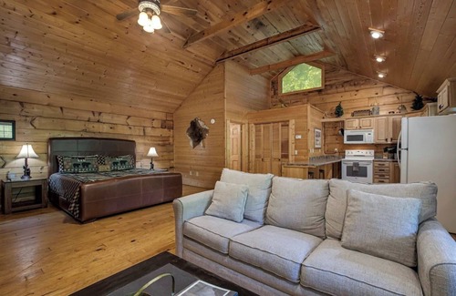 This modern log cabin is a large studio with all of the 'bells and whistles' !!! There is a very important looking king size bed, gorgeous mountain decor, fold out sofa, Adirondack chairs for the porch and old-fashioned porch swing. Full kitchen, one bath, 65" Smart TV with Fast WiFi. Tucked into the woods with a BIG hot tub, this is perfect place to celebrate or honeymoon. Come with friends. Or be selfish and bring her just to be together. Well, you could bring the pup too.