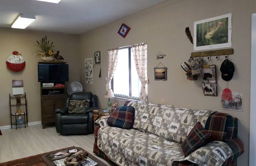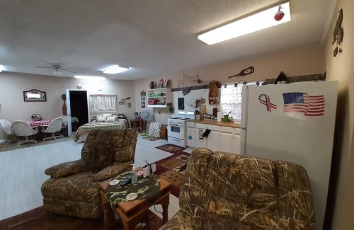 Nice, newly remodeled large cabin; sleeps up to 8; one bedroom (2 bunk beds) with additional sleeping in living area (queen bed and hide a bed); one full bath; complete kitchen (refrigerator, stove, micro, coffee pot, toaster oven, dishes, pot and pans); lots of seating and covered front porch; ample parking for several vehicles/boats; lake access across the highway or 2 miles to a concrete launching ramp.