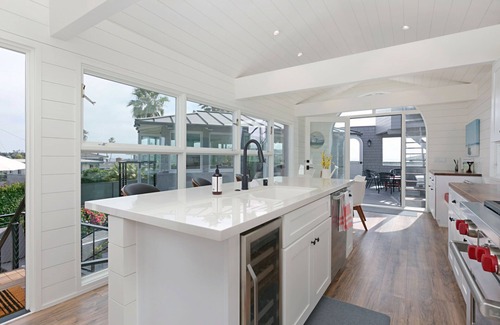 This beach house is the ultimate retreat for a family beach vacation or couples seaside getaway, as it offers an extraordinary private escape. The house is a maze of cozy nooks and creative niches, from its garden patios to its rooftop deck that affords 360-degree views of the ocean and lagoon. As you sip sunset cocktails up top, you can watch the surfers charging waves in the company of dolphins. Whether you want to paddle out or picnic on the golden sands, this stellar beach house gives you front row access to one of California’s finest beaches and a true taste of Del Mar’s coastal-chic lifestyle.