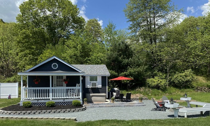 The cottage is the perfect adult only getaway; not suitable for children. It’s nestled high in the mountains less than 4 miles from town and is across the street from the Delaware River. It is located two miles from Kittatinny and Indian Head Canoes and close to hiking, skiing, biking, golfing, breweries, wineries, shopping, sightseeing and historic Milford, PA. Enjoy the in-ground pool, hot tub for two, fire pit, outdoor games, hammock or fishing in the Delaware. Private river access is less than a two minute walk.