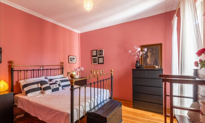 This renovated 50's apartment comprises of a cozy living room with hand made pillows, a vibrant fully equiped modern kitchen in red and black, a comfortable dining-room , a turquoise small-tile bathroom, two relaxing bedrooms: a dark pink vintage one with an antique double bed and a turquoise one with a modern fresh feel. An oasis of plants in the balcony offers a hug in the end of the day.