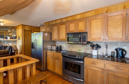 This three-level home includes an open concept main level space with the living room flowing into the dining area and kitchen. A fully covered screened sunroom/porch has cozy seating around a gas log fireplace and an alfresco dining table. The secluded hot tub is on the deck to the side of the house. There is a king bedroom on the main level with in-room access to the main floor jack-and-jill bathroom. The open loft sleeping area above the living room has a queen bed, a twin bed and trundle, a TV, and a full upstairs bathroom. The lower level features a cozy family room with a game/puzzle table, couch, and TV. There is a bedroom with a full bed on the lower level and a twin day bed with a trundle in the family room area.