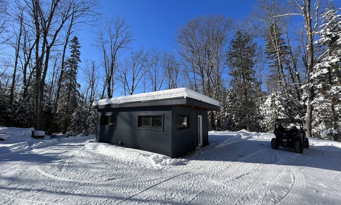 Enjoy the lovely setting of this unique romantic spot in nature. This modern tiny house is equipped with a comfy queen bed, sofa, dining table, fully stocked kitchen, full bathroom, hydro and running water. From the main road, drive 500’ through the forest and park your vehicle right by the cabin. Spend the day walking the many trails in the area or exploring the lakes that are a quick drive, bike, ATV or Snowmobile ride away. Relax by the firepit during the evenings while stargazing.