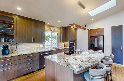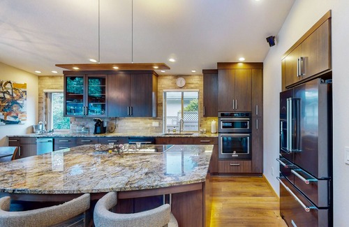 Inside, the real magic reveals itself with stunning architecture, high-end finishes, loads of natural light, and all of the comforts needed to feel right at home. The open-concept layout is ideal for entertaining and reminiscing with loved ones in style with a stunning full kitchen, vaulted ceilings, flatscreen TV, and a lovely dining table create an ambiance you will never want to leave. Plus, the chef of the group will be spoiled with two sinks, gorgeous countertops, stainless steel appliances, and luxury cookware that will make any recipe a breeze. Don't worry about needing to get a bit of work done while away either, as a desk, printer, and high-speed WiFi are provided.