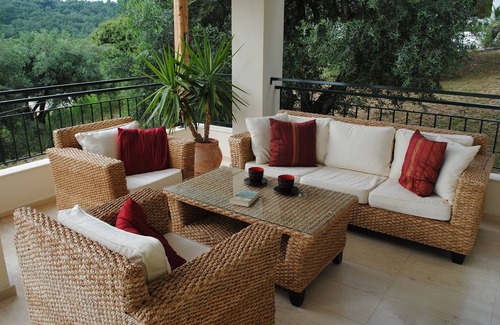 There are two double and two twin bedrooms each with en-suite bathrooms. All bedrooms are fitted with air conditioning, and have vaulted ceilings and ample storage facilities. French doors from the bedrooms lead onto a balcony that runs the entire length of the villa, providing wonderful views of the Corfu Channel and Albanian mountains. The master bedroom has space for a cot and a futon for younger children, enabling the villa to accommodate 8 adults and 2 young children. The bathrooms for the two double bedrooms have been recently upgraded and feature "hotel style" walk in showers.