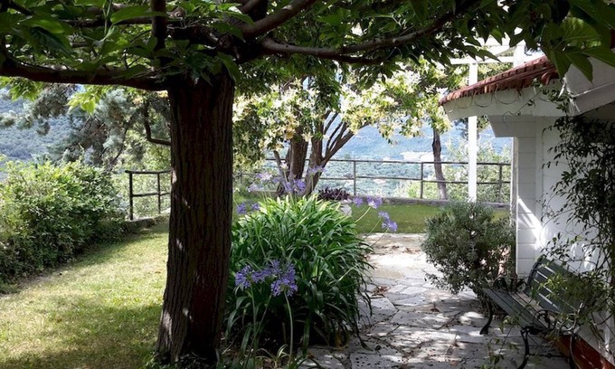 Solid wood cottage with garden, surrounded by greenery, intimately secluded and sunny. Closed parking. Panoramic view of the valleys and sea covered by greenery.
