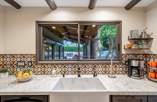 Prepare meals for friends or family in the beautifully designed, recently renovated kitchen with a rich Spanish tile backsplash, lots of storage space, a center island, plus a farmhouse sink with a window overlooking the back yard.