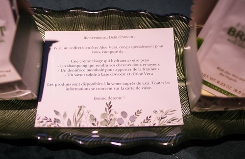 Several welcome gifts are offered: body care products, shampoo, soap, bottle of water and bottle of tropico.