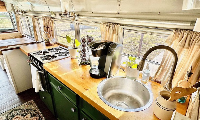 Delta Dawn, a meticulously converted school bus, awaits you with its unique and welcoming ambiance that embodies the essence of the South. Step on board, and you'll be immersed in a cozy interior adorned with tasteful decor, paying homage to the region's unique charm. This bus provides all the amenities you need to make your stay special.