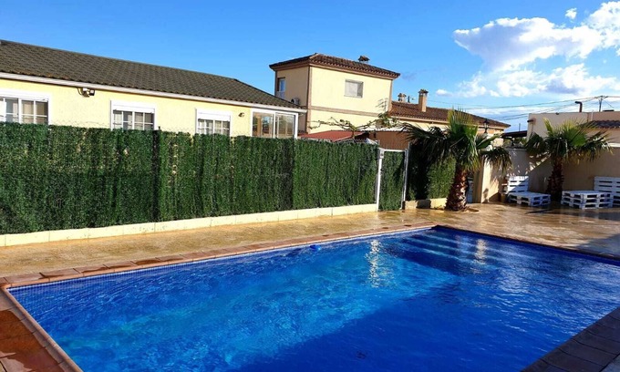It is a villa, with its fenced plot for total privacy, with barbecue and garden furniture. Share a pool with another villa of our property, the pool is large and has a very large common area. The house has a living room and kitchen (fully equipped) all together and very spacious. It has 2 full bathrooms with shower and 4 bedrooms (1 with 3 single beds, 2 rooms with 1 double bed and one single, 4 rooms with 4 single beds.