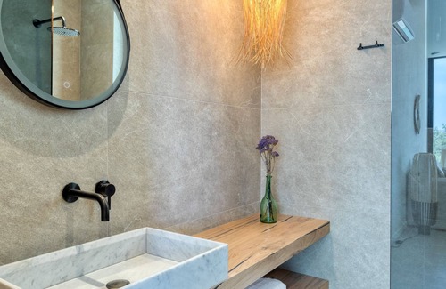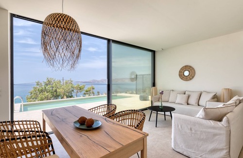DELTA VILLA (accepts up to 6 person) Not recommended for kids under 10 years old. The 80sq interior is composed of 3 bedrooms (double beds), 2 bathrooms, 1 ensuite, accommodating up to 6 visitors. The open plan living-dining area and the fully equipped kitchen looks directly through wide windows- from floor to ceiling - the pool terrace and sea view. At the 170sq terrace, the visitors can enjoy the private swimming pool all day and night and all the daily meals in the dining area. Help yourselves to a glass of wine or a cocktail drink and enjoy the sunset next to the pool.