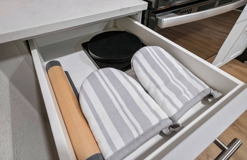 *Fully Stocked Kitchen: Unleash your inner chef in our fully equipped kitchen, complete with all the cookware, utensils, and appliances you need to prepare delicious meals. Enjoy a Keurig coffee maker with complimentary K-cups and tea, along with salt, pepper, and oil for your cooking needs. Casual dining is available at the island or the pub table for two. Complimentary dishwasher pods, dish soap and hand soap to make cleaning up easy.