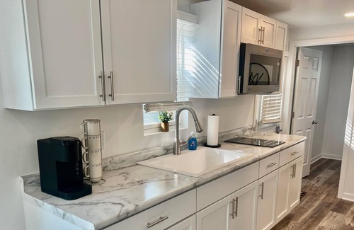 Our gorgeous air-conditioned deluxe cottages have an open floor plan with a modern farmhouse chic decor. They feature one bedroom with a queen bed, plus a queen sleeper sofa in the living room to comfortably accommodate up to 4 guests. The galley kitchen comes with upgraded appliances that include a stainless-steel refrigerator, electric cooktop, microwave, Keurig coffee maker, toaster, cookware, dinnerware, and utensils. There is also a gravel patio with Muskoka chairs, a fire ring, picnic table, and BBQ for outdoor entertaining. There is a refundable $250 security deposit required as well as a non-refundable $50 cleaning fee due at check-in. Linens, towels toiletries are not provided. NO PETS ARE ALLOWED.