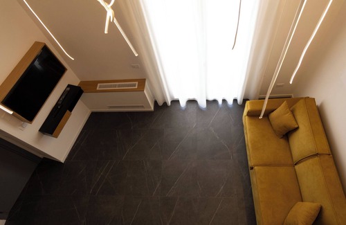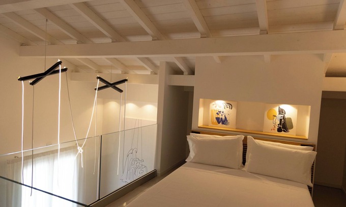 Charming apartment on 2 floors, the Loft Deluxe, (located on the second floor without elevator) enjoys a comfortable terrace overlooking an inner courtyard with plenty of privacy. It is about 40 sqm, with private bathroom. Living area, with kitchenette, and sleeping area with double bed, separated by an internal staircase in fine wood with a modern design. Additional bed made from a comfortable sofa bed in fine "alcantara".