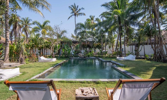 Small pavilions with alang alang roofs scattered in a lush garden with an infinity pool await you.