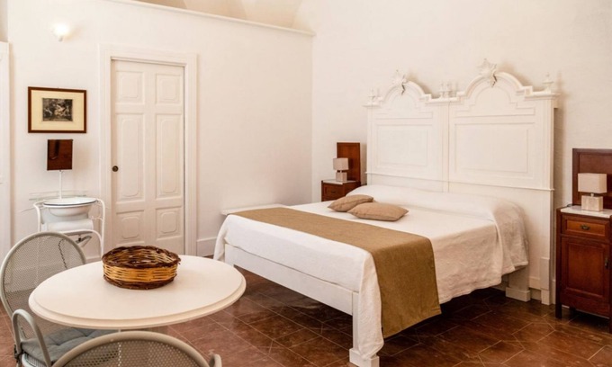 Large room with toilet, fireplace, panoramic sea view terrace on the first floor. Double bed, possibility of a third bed. The room, the walls, the fireplace, the furnishings are linked to the tradition of the Salento farms.