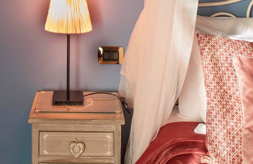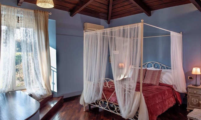 The accommodation is located in a splendid period villa, furnished with antique furniture combined with modern elements. Every room in the hotel has a distinctive "theme": the "Romance" room features Provencal furniture, canopy bed with voile, large closet, antique toilet cabinet, smart tv, wi-fi, heating, air conditioning, fridge-bar, espresso machine, private bathroom with shower.