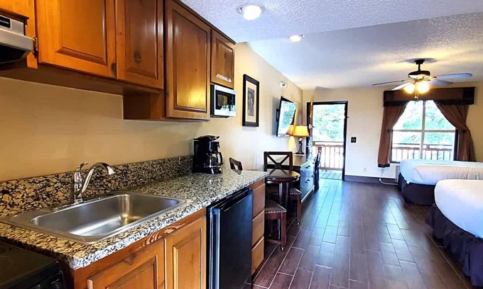 - Family Deluxe Lodge Suite: full kitchen + arcade + walk to pool and rodeo