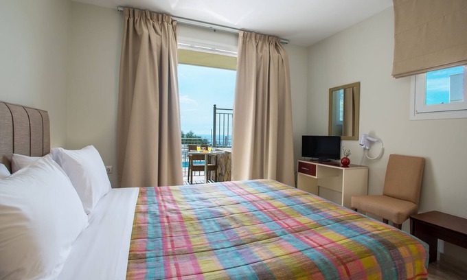 Our 50sqm rooms come with a double and two single extremely comfortable beds. The apartments are adjacent to the pool and have a spacious private veranda, supplied with outdoor furniture, which makes them ideal for families. Only a few steps separate you from enjoying your coffee or drink, while your children enjoy playing and swimming at the pool. The room is a single space with a separate bathroom. Amongst its features is the ability to prepare a meal in the kitchenette provided in the room.