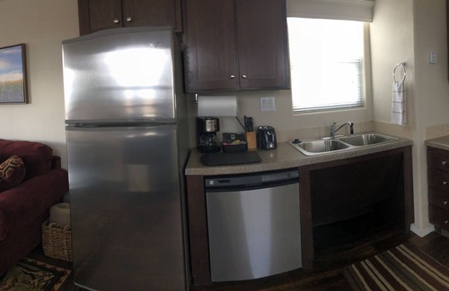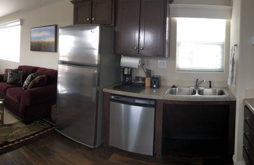 Our "wheelchair-friendly" Sunset Bungalow is equipped with a full kitchen, full refrigerator, queen size bed and large bathroom making it our most accessible Bungalow. This Bungalow now includes a pull out bed for those looking to sleep up to 4.