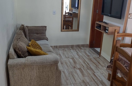Apartment with 1 bedroom with 1 double bed and 1 bunk + mattress, kitchen complete with all utensils (cutlery, dishes, microwave, pots, stove, refrigerator etc ...) air conditioning in the room and private bathroom. Furnished and equipped. New structure, made this year. Next to the Park Beto Carrero and near the main beaches in the area (Armacao Beach, Red Beach, Prainha de São Miguel, Gravesend Beach). The town is next to several well researched cities like Balneario Camburiu, Brusque, Itajai, Blumenau, etc ...