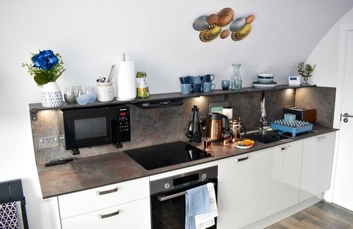 The nattily designed open-plan kitchen has everything to make conjuring up meals a breeze: oven, microwave and fridge. Basic condiments and olive oils come as part of the package along with a (very) welcome hamper containing essentials like tea, coffee, pastries, juice and Prosecco.