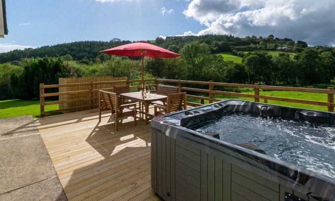 A comfortable holiday home with private hot tub and lovely views across farmland towards the Brecon Beacons. A short walk from the village of Pentre Bach and its excellent pet friendly community pub. Spacious and cosy, with plenty of walks from the door and many scenic attractions to discover, including waterfalls, canal paths, castles, and Brecon Beacons National Park.
