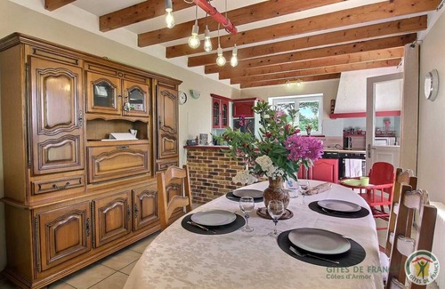 Your single-storey vacation rental includes: a 14 m² south-facing veranda (opening onto the 16 m² paved terrace), a living room-lounge with kitchen (non-functional fireplace, Nintendo Wii console available), a back kitchen-laundry room , 3 bedrooms: 2 single beds. (90x190), 1 double bed. (160x200), 1 double bed. (140x190), a bathroom with shower and bath, a toilet, wide corridors with storage. Games on site: skittles, boules, Badminton kit. Baby equipment available. A corner of the closed garage is available (ideal for storing bicycles or other equipment). Paved courtyard of 150 m². Garden at the same time on the front and the back of the lodging, three hens in the henhouse close to the greenhouse, ground of balls bordering a basin with protected water. Enclosed land. Beautiful location for this accommodation in a rural setting, at the entrance to the peaceful town of Gausson. Philippe shares for you this family asset that he maintains with love. Everything is bucolic and rural, nature and simple things are omnipresent. From there you will climb with the same distance (75 km) either to Lannion and its Côte de Granit Rose or to Dinard and its Côte d'Emeraude. Much closer, 25 km away, the sea is revealed in Yffiniac and Saint Brieuc, whose bay is renowned for its scallops and mussels. Your escapades can also take you to the small towns of character of Moncontour (13 km) and Quintin (24 km) but also to Lake Guerlédan (27 km). Note: about 100 km away are the cities of Rennes, Vannes and even Lorient! In short, you will have understood: between letting go, going back to basics and outings for walks, your stay will mark you.
