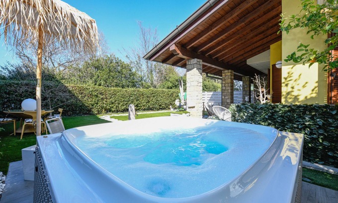 CIN IT017067C2ZVHSYZM8 Welcome to Villa Jacuzzi and Garden Beach!If the photos have caught your attention, now let yourself be enchanted by the description of this magnificent villa, designed to offer you a stay full of comfort and relaxation.The villa is located in a quiet residential neighborhood with excellent connections to the main attractions in the area. Just a few steps away, you will find the train station, the bypass road that allows you to quickly reach cities like Verona and Brescia, as well as the A4 highway exit, the main connection between Milan and Venice. Additionally, you can shop at the large shopping centers "Il Leone" and "Le Vele" or at nearby supermarkets such as "Lidl" and "Esselunga."As you step through the villa’s gate, you will be welcomed by a large, well-maintained garden with artificial grass, which always looks neat and inviting. Here, you can relax and enjoy the fresh air in an area equipped with a barbecue, table, and chairs, perfect for outdoor dining or enjoying an aperitif surrounded by greenery. However, the true highlight of this space is the brand-new luxury Jacuzzi, ideal for moments of pure relaxation. It accommodates up to four people at the same time, ensuring a completely relaxing experience.Upon entering the villa, you will be greeted by a spacious living room, elegantly decorated with great attention to detail. The large sofa not only provides the perfect place to relax but can also be converted into a comfortable double bed for additional guests. The fireplace, luxurious chandeliers, and crystal dining table contribute to a sophisticated and inviting atmosphere, while modern amenities such as air conditioning, high-speed fiber-optic Wi-Fi, and a large Smart TV complete the setting.The kitchen, also located on the ground floor, is fully equipped to make your stay even more comfortable. You will find all the essential appliances, including a dishwasher, capsule coffee machine, and microwave. There is also a table with chairs, ideal for enjoying a relaxed breakfast, even on rainy days.Upstairs, you will find the sleeping area, consisting of two spacious double bedrooms. Both rooms are equipped with air conditioning, a large wardrobe, a Smart TV, and a private balcony overlooking the garden—perfect for enjoying the serene atmosphere. To ensure optimal sleep comfort, each bed features a high-quality topper designed to provide extra support and enhance your rest.The villa has two modern and elegant bathrooms. The first bathroom holds a delightful surprise: an indoor Jacuzzi where two people can relax at the same time. The second bathroom features a spacious shower and also includes a washing machine for guests’ use. Both bathrooms are equipped with a toilet and bidet, ensuring maximum comfort and convenience.To complete this unique experience, the villa offers high-speed fiber-optic Wi-Fi, a reserved outdoor parking space, and air conditioning in every room, guaranteeing a pleasant stay in any season.Another major advantage of your stay is the personalized concierge service, always available to meet your needs. We aim to provide you with an authentic and stress-free welcome: for this reason, key handover is done in person, without the use of code boxes or unnecessary travel. A week before your arrival, a dedicated concierge will be available to answer all your questions about the apartment and the area in Italian, English, German, Spanish, and Portuguese. Upon arrival, the concierge will personally accompany you to the villa and will be available throughout your stay to ensure that your experience is flawless. At departure, they will be there to bid you farewell and verify that everything met your expectations.Check-in at the property is available between 3:00 PM and 7:00 PM. For late arrivals, check-in can be arranged until 11:30 PM for an additional fee of 50 E, payable in cash directly to the hostess. The villa also requires a security deposit of 300 E, which can be paid in cash or by credit card. If the deposit is paid in cash, it will be refunded by bank transfer within three business days after departure, provided there is no damage.DesenzanoLoft is pleased to provide guests with complimentary bed linens and towels, as well as a welcome kit to make your stay even more enjoyable. This elegant villa, perfect for up to six guests, guarantees you an exclusive and unforgettable experience on the shores of Lake Garda.Book now and get ready to enjoy a dream vacation!