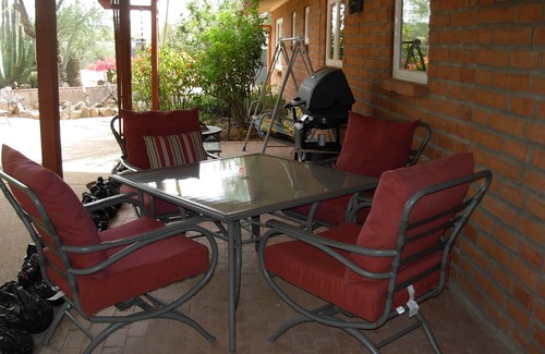 GUEST ACCESS: Guests have full access to the fenced backyard, horse corral, laundry room with washer and dryer (free), and the remainder of the 5 acres of Sonoran Desert. They will be provided with a guest code to open and close the gate to the ranch. The heavily treed backyard has a large shaded and covered veranda off the kitchen, with cushioned chairs and glass table, a propane grill, a swing set, 6 citrus trees, flower beds, rose bushes nestled among the ironwoods, Aleppo pines, and palo verde and mesquite trees.