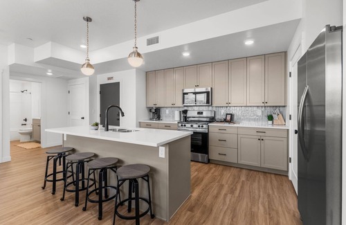 - Fully equipped kitchen with stainless steel appliances and dining area