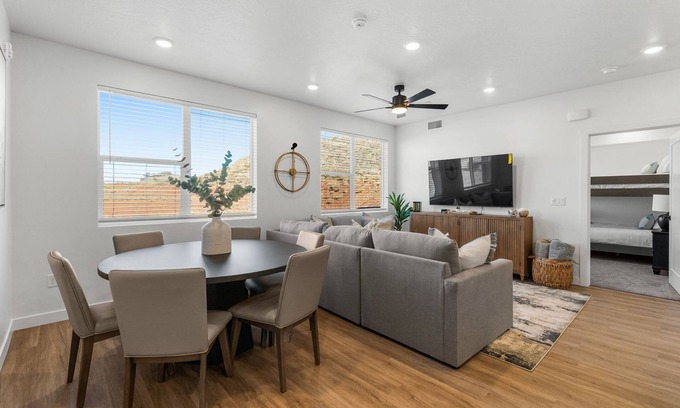 Welcome to Desert Breeze Retreat, a charming 2-bedroom, 2-bathroom condo in the heart of Hurricane, Utah. Perfect for families or groups of up to 6 guests, this retreat features a spacious king master suite and a second bedroom with two queen bunk beds, ideal for both adults and kids. Guests will enjoy modern comforts, free parking with toy trailer spaces, and access to resort amenities including pools, a fitness center, and the Lazy River.