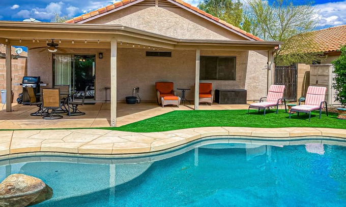 This private oasis is located in a quiet Apache Junction neighborhood, making it a perfect stay for your next family or friend visit. Boasting an effortless indoor/outdoor living flow, you'll love spending hours splashing in the heated pool, equipped with a Baja shelf, waterfall, and pool spa. For extra privacy, the backyard is surrounded by a seven-foot wall.