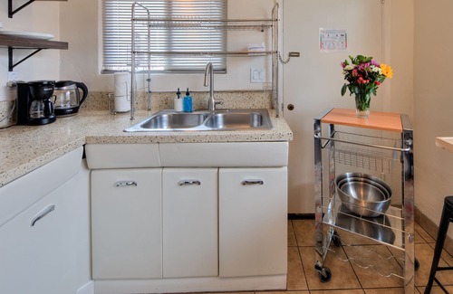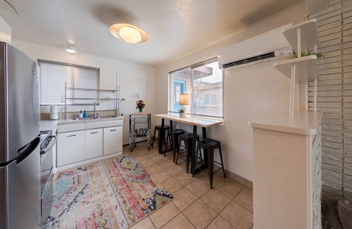 At Desert Gardens #2, you will enjoy numerous amenities designed to enhance your stay. The unit includes a fully stocked kitchen, allowing you to prepare meals or easily grab takeout from nearby restaurants like Thai Bella, just across the street. Unwind in the inviting living area equipped with Samsung smart TVs for your entertainment, or step outside to bask in the beauty of the lush gardens, which feature a year-round hot tub, outdoor seating, BBQ grills, and a relaxing hammock. The expansive grounds provide ample space for mingling and enjoying moments of tranquility amid vibrant flora.
