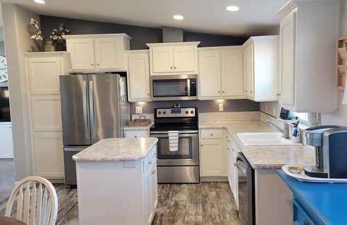 We have an open floor plan with two bedrooms on one end, living room and kitchen/dining area in the center of the home and the primary suite on the other end of the home. There is a fully stocked kitchen, Smart TV, DVD player with a ton of movies, Xbox 360 (with some games) and card and board games. A full-size washer/dryer for your use too.