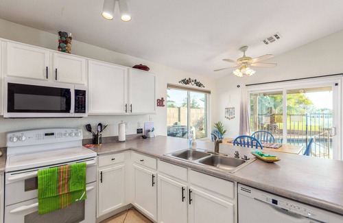 Outdoor fun is a given with a private yard and covered patio plenty of outdoor seating with gas grill next to the pool. Steps away is a family-friendly park with basketball courts, walking path, BBQ tables, sandbox and playsets. 15 minutes from Phx/ Mesa Gateway airport. Close by to many Mesa dining opportunities, Golfland Sunsplash and shopping centers! Golf courses, hiking, Salt River activities, and Tonto National Forest - all within a short drive! This charming retreat is perfect for families or friends looking for a serene escape. Enjoy all that Mesa has to offer when you stay at our place. TPT21396830