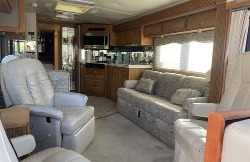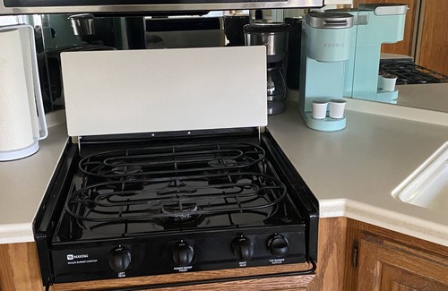 Relax and unwind in our unique, tranquil, and comfy Guesthouse-RV in beautiful Sunny St. George! Sleep Number Queen Mattress in the private bedroom...oh so comfy! A full-size couch folds down to a bed and another twin bed as well. Full kitchen with gas stovetop and large Convection oven/microwave. Washer/dryer. 2 flat screen Roku TVs. Small adult sitting pool(not heated) with relaxing waterfall/fenced-in space in private backyard, relax on the lounge chairs and soak up some St George sun!