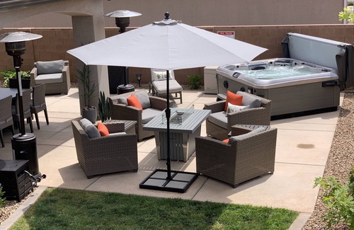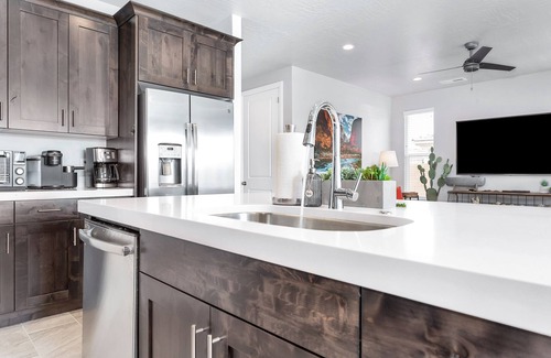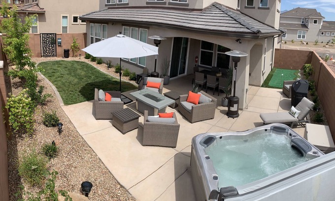 Enjoy this beautiful brand new luxury 5 bed 4 bath private home located in Washington, Utah and only 32 miles from Zion National Park. This luxurious home is a short drive away from golf, hiking, Sand Hollow and St. George, Utah. Boasting a large fenced in back yard with extensive seating and dining, fire pit, and private hot tub - this is an ideal rental for friends getting together or the perfect family reunion. This home has brand new top of the line appliances in the fully stocked gourmet kitchen. Enjoy plenty of seating in the dining area as well as the breakfast bar. The dining space extends outside, where the large outdoor patio has extra dining, BBQ, fire pit, and enjoy soaking in the hot tub after a long hike or bike ride.