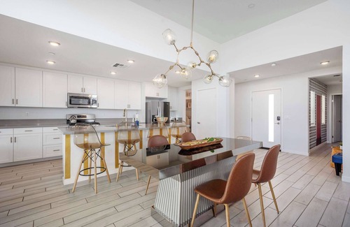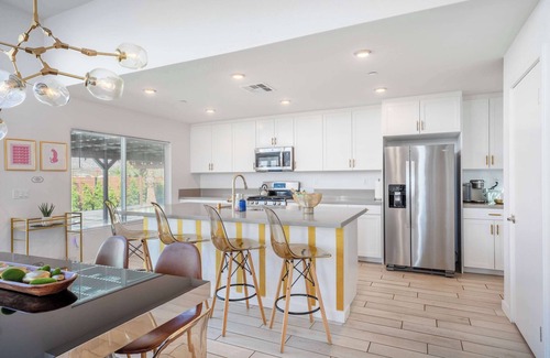 Nestled on a sprawling 10,000 sq ft lot, this stunning desert retreat blends mid-century modern and contemporary design seamlessly. Enjoy expansive indoor-outdoor living with soaring ceilings, abundant natural light, and mountain views. The backyard oasis features a luxurious pool, spa, putting green, and pickleball court. Inside, relax in the spacious living area, dine in style, and cook up a feast in the modern kitchen. The primary suite offers a serene retreat with an en suite bathroom and vanity room. Each bedroom features plush mattresses and plenty of space for your belongings. Enjoy cozy evenings around the fire pit, star gaze in the swinging chairs around the pool, and spend hours in the game room!