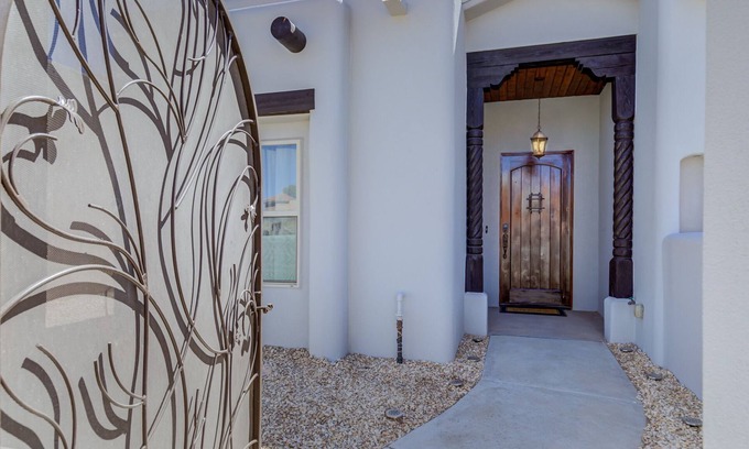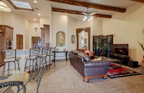 This is our home away from home and we want to share it with you. Feel all the comforts of home along with the luxury that you deserve! This exquisite retreat is 1,750 sq ft of southwestern flair with lots of ceramic tile, nichos, skylights, and high ceilings with log beams. The large master suite at the back of the house has a private entrance that opens to the back patio. The suite allows you time to read, watch TV on the HD Smart TV, with various apps available or watch the sun rise with a nice cup of coffee or tea. Fresh clean linens are provided with lots of pillows and blankets and a gorgeous sunrise to wake you up. The beautiful master bath located off the master suite has a large relaxing jacuzzi tub, separate shower, double vanity, a walk-in closet and a separate/private privy. We have fully stocked bathroom with items such as toilet paper, a blow dryer, towels, etc. for your stay. A second bedroom is located in the front of the house with a queen bed and easy access to a separate front bathroom. Across the hall is a third bedroom with a double bed.