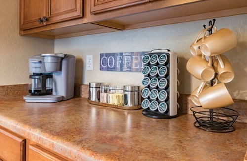 Morning caffeine fixes are no problem with a Keurig 10-cup coffeemaker, plus a single pod option. Best of all, we provide a complimentary supply of coffee, coffee pods, tea, and sweeteners to get you started on your culinary journey!