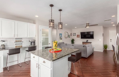 We understand where you stay can greatly impact your travel experience which is why we have worked diligently to think of everything you might need to make your stay enjoyable. Our home provides 3 bedrooms, one with two queen beds and the other with one Trundle bunk bed and game room! The home also offers 2 full bathrooms, a fully functioning kitchen, an in-unit washer and dryer, smart TVs, a smart thermostat, high-speed internet, and a spacious living room that will make you feel like you never left home. The back patio is perfect for relaxing and enjoying the day, while the grounds and pools are well-manicured and maintained. Challenge each other in a game of pool or shuffleboard in the game room. BBQ with friends and family in the massive backyard and take a relaxing dip in the pool. Enjoy your evening by the fire pit and start a cornhole tournament This home has everything you will need! There are two designated parking spots on our driveway and ample visitor parking. Our property is always professionally cleaned between visits.