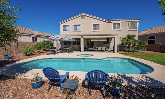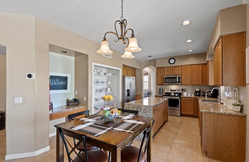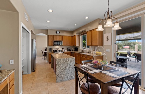 you'll find fruit trees, a grassy area for outdoor play, a large patio with dining area next to the pool and spa, and breath-taking desert sunsets. We want to make your stay as pleasurable as possible: luxurious linens on the beds, towels and toys for the pool, and games from board games to billiards and darts. Mealtime is a breeze on the backyard BBQ or in the well-appointed, eat-in kitchen with stainless steel appliances, and Keurig and Mr.Coffee coffee machines. 5 BEDROOMS FOR 1-12 Guests.