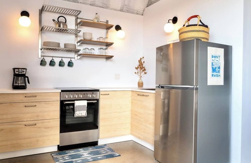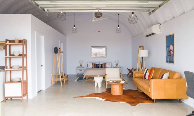 Desert Sky blends the best that Marfa's landscape and downtown attractions have to offer. An open-plan layout maximizes unobstructed views of the desert. The front wall of the space is a garage door that has windows built in to allow light and the view to filter in even when closed, and which can be rolled up to allow full access to the desert view and sounds. You can lay in bed and watch the sun come up with the door rolled all the way up while letting the cool morning air and birdsong in, or stargaze with the door down and the A/C blowing. The patio chairs in front of the hut offer some of the best, most comfortable (and most convenient!) views of the Marfa lights you'll ever experience.