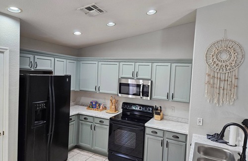 Your Desert Valley stay is the perfect location for gathering with family. Enjoy peaceful, cozy evenings in the living room with your 65-inch TV, unlimited streaming options, board games, or books. Soak up the year-round sunshine that the Grand Canyon State offers in your large, private backyard featuring a cozy wood-burning fire pit, hammock swing, and a grass area perfect for your pets or kiddos to run around.